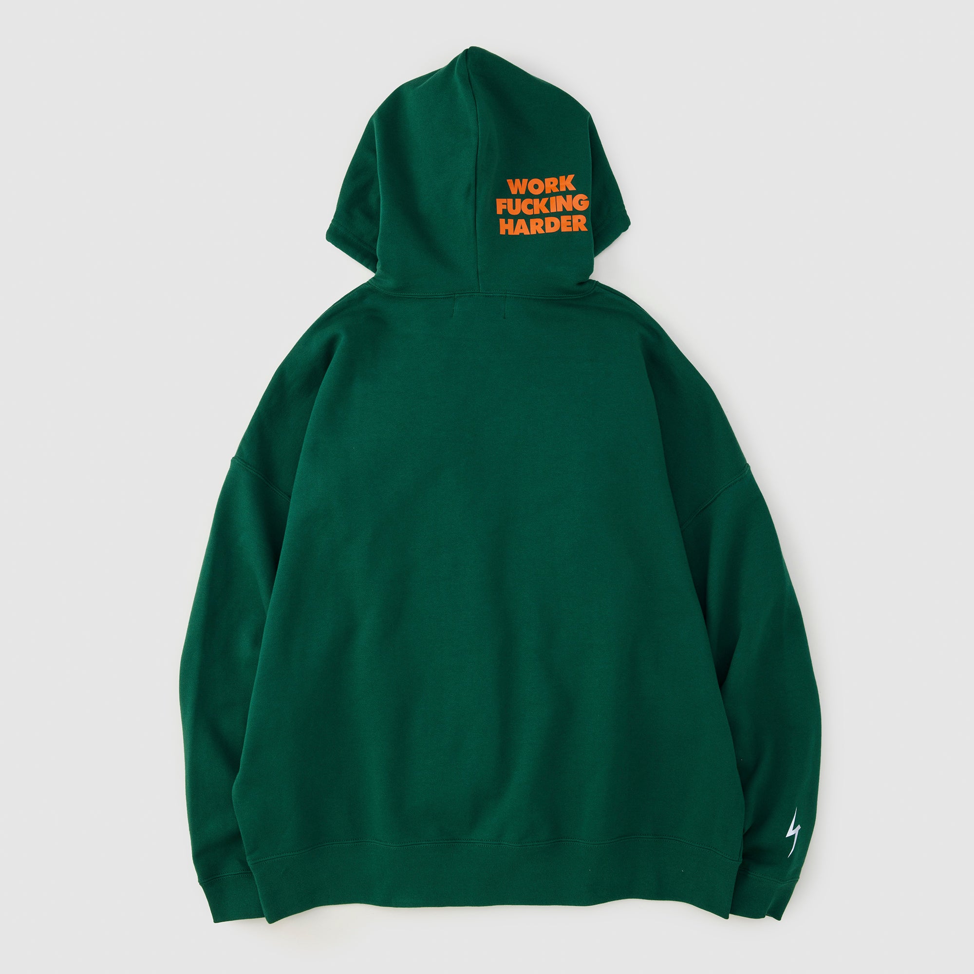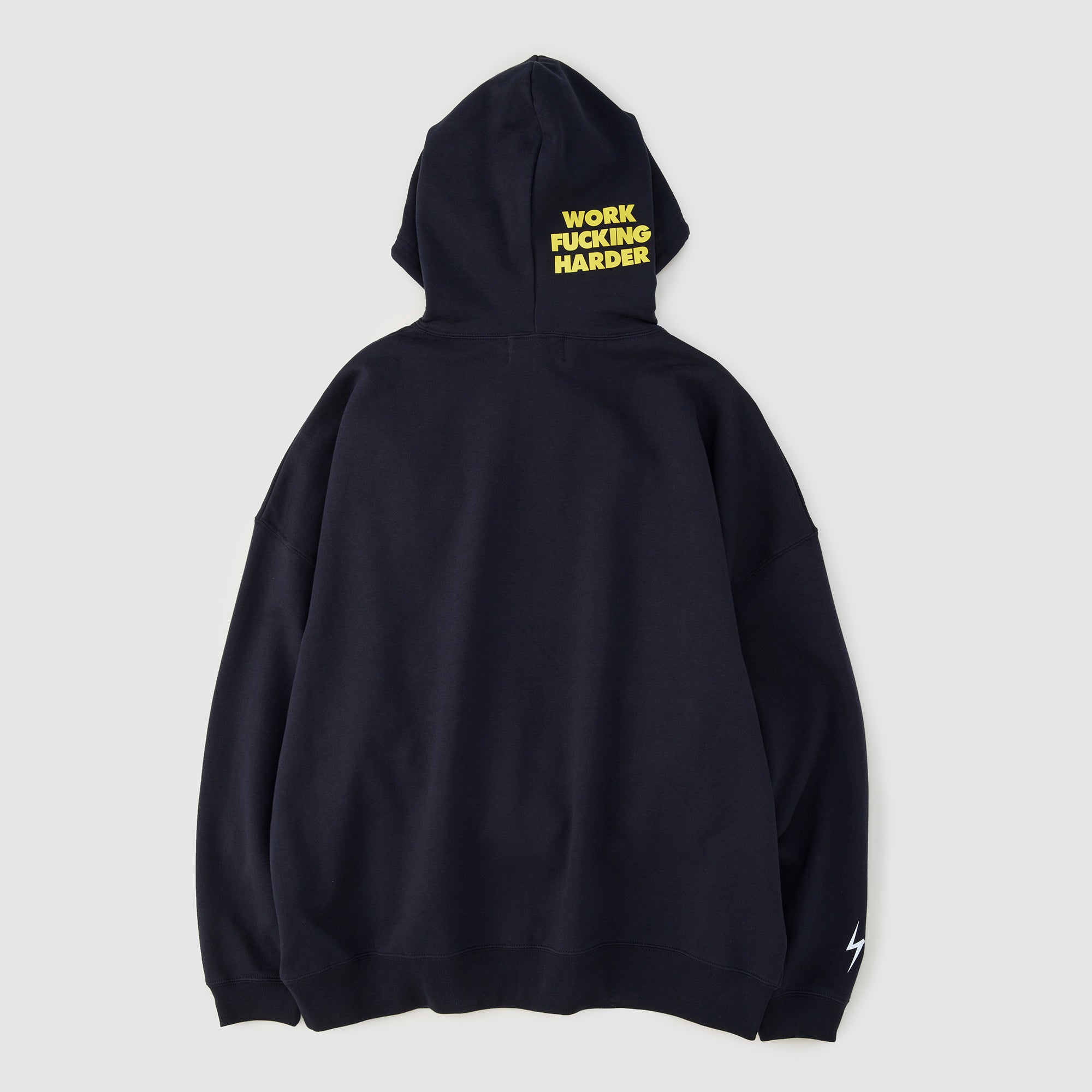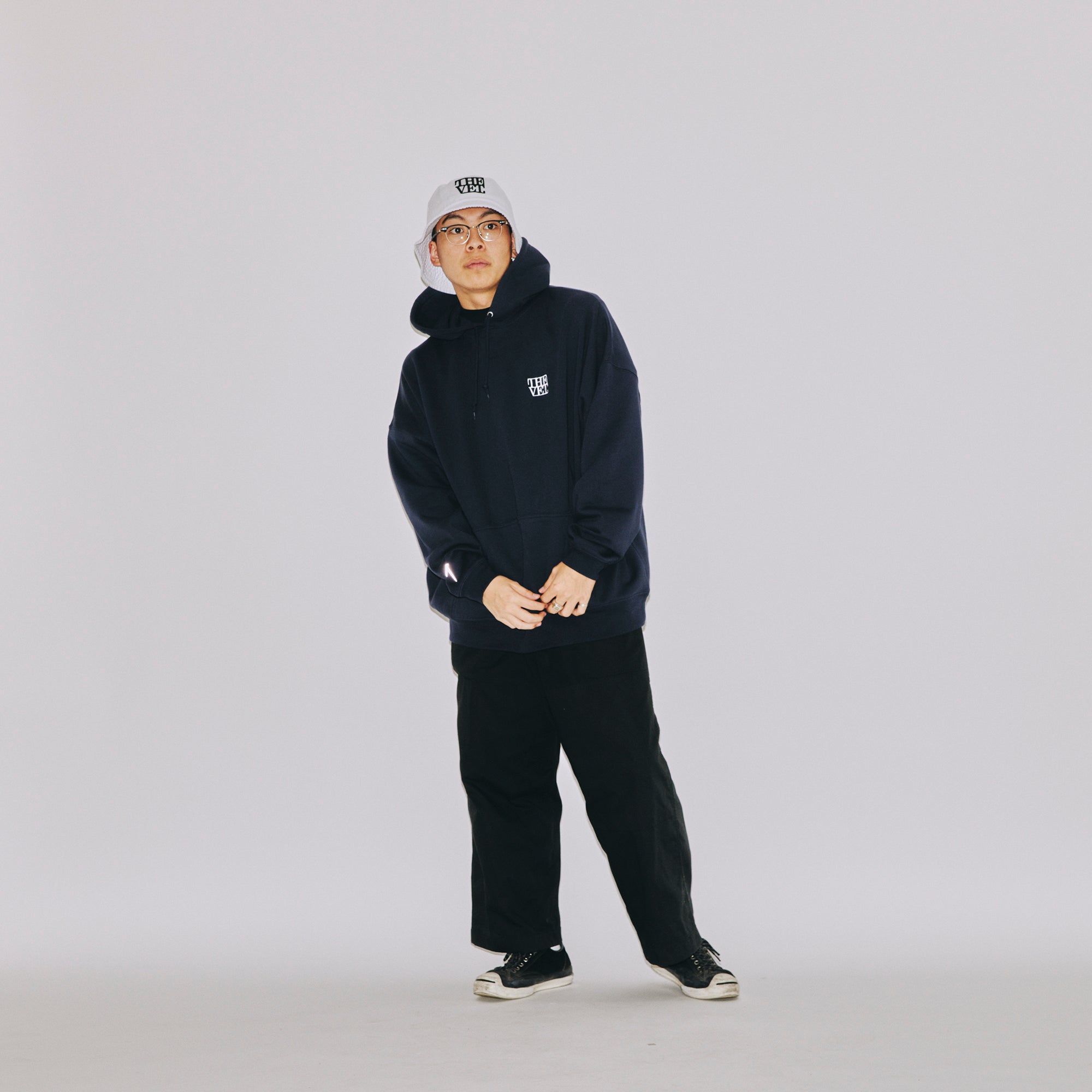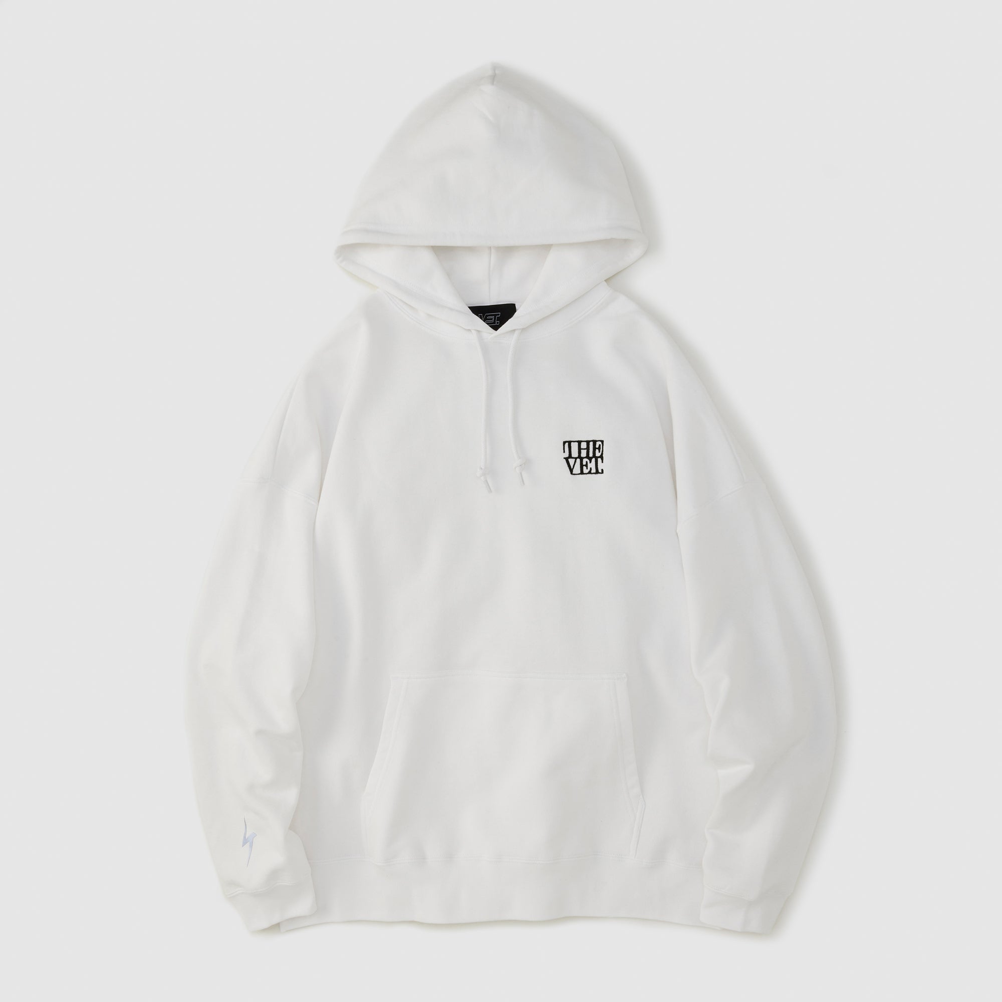左胸に「THE VET.」の刺繍が入り、右袖に「VTカミナリ」のリフレクタープリント、フードを被った時に見える「WORK FUCKING HARDER(もっと頑張れ」のプリントが入った、ビッグシルエットの10オンスの裏パイルスウェットプルパーカー。裾まわりのシルエットが浮かないように絞り込んだ裾口や、ほどよい溜まり感のある袖。フードひものチップ加工。