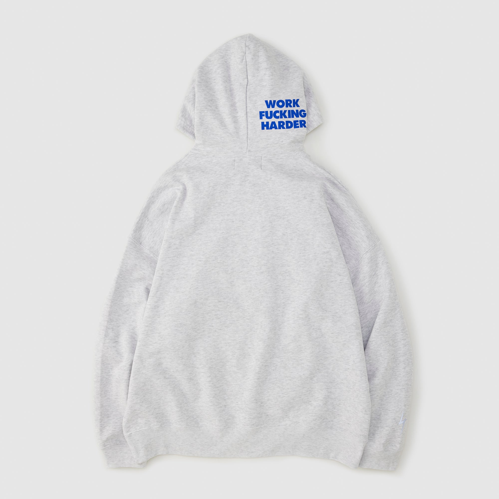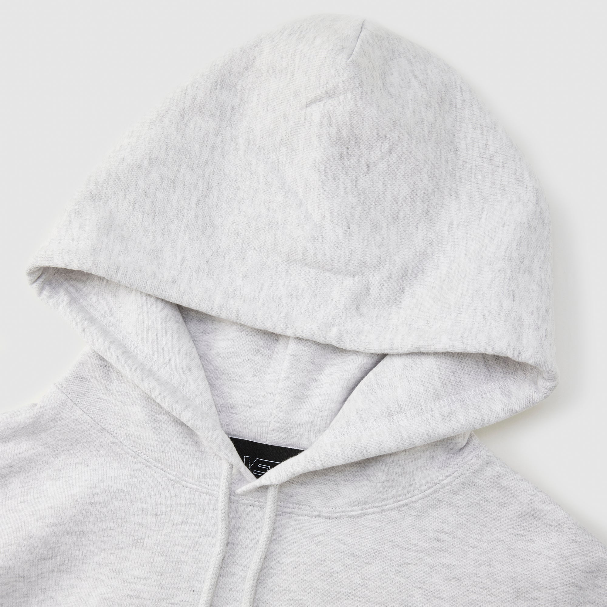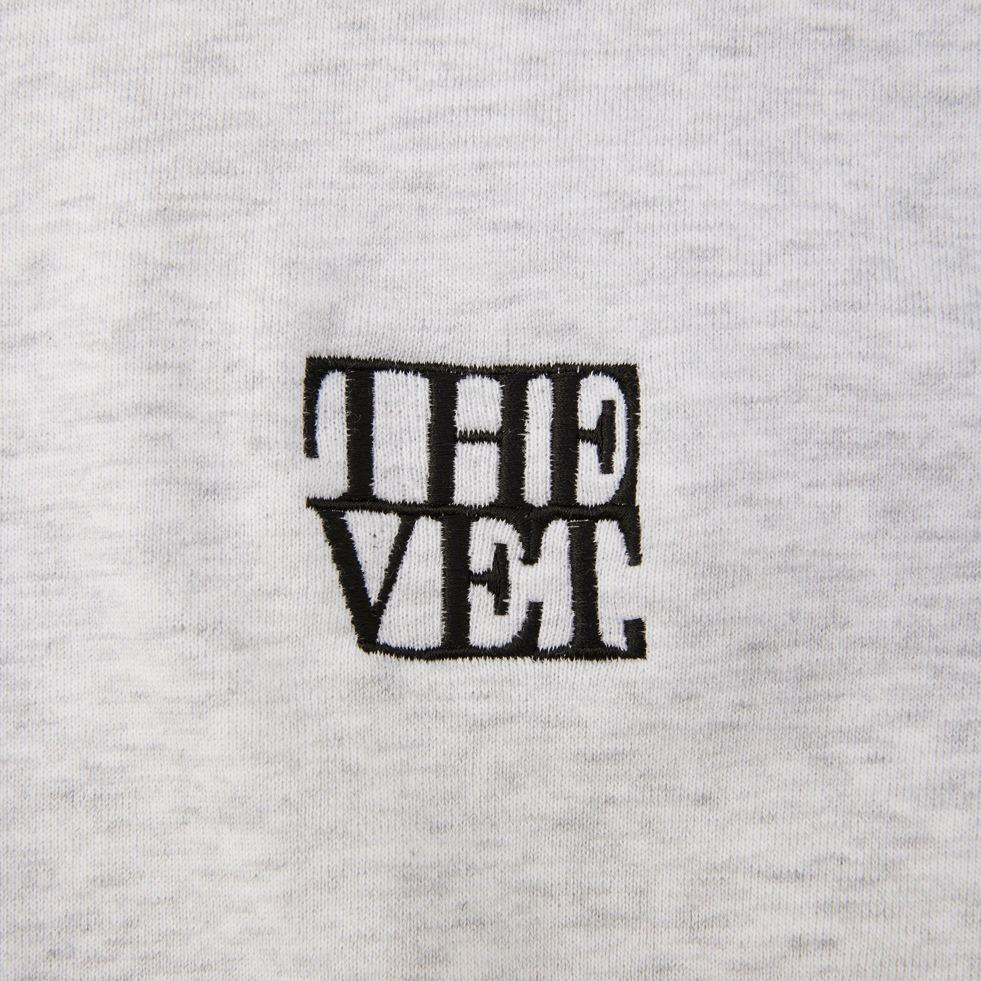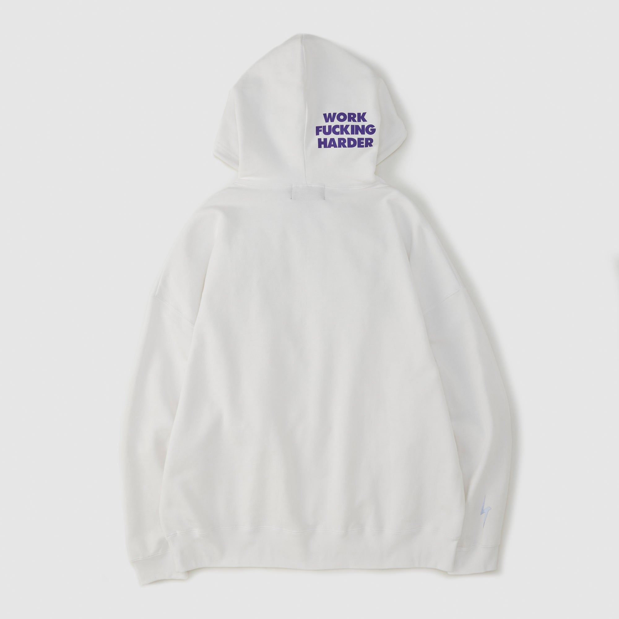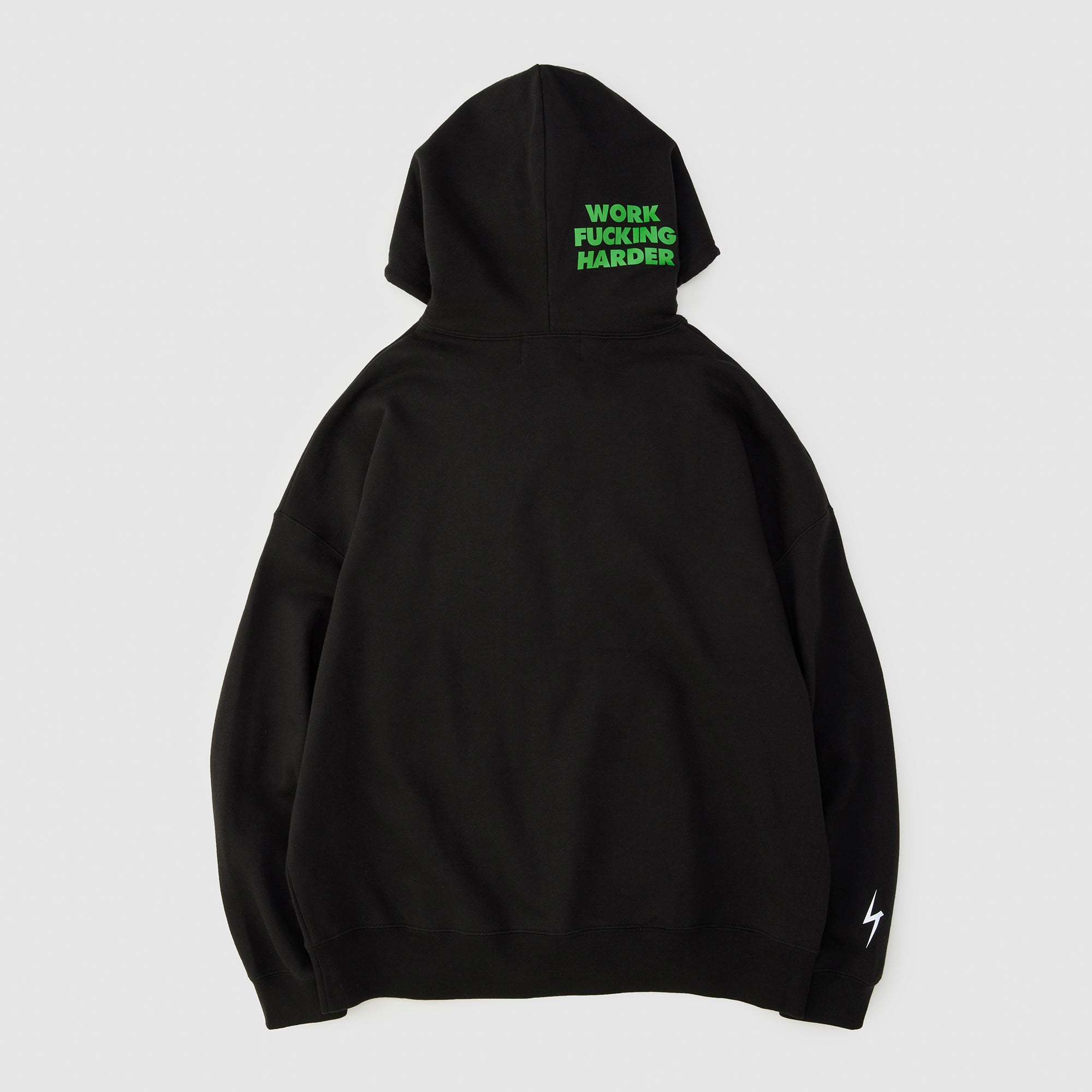 左胸に「THE VET.」の刺繍が入り、右袖に「VTカミナリ」のリフレクタープリント、フードを被った時に見える「WORK FUCKING HARDER(もっと頑張れ」のプリントが入った、ビッグシルエットの10オンスの裏パイルスウェットプルパーカー。裾まわりのシルエットが浮かないように絞り込んだ裾口や、ほどよい溜まり感のある袖。フードひものチップ加工。