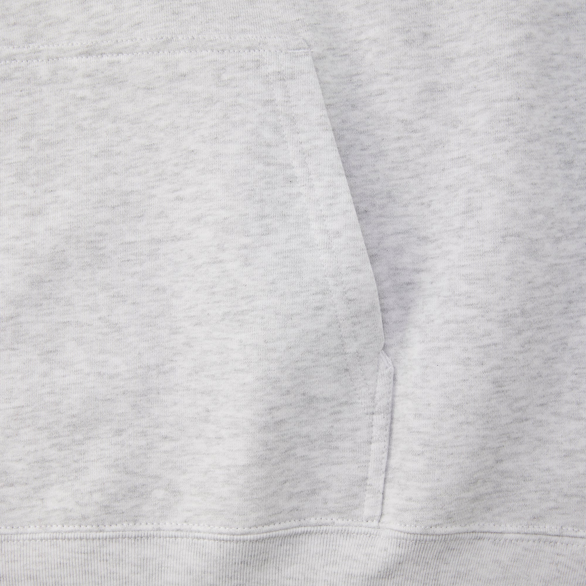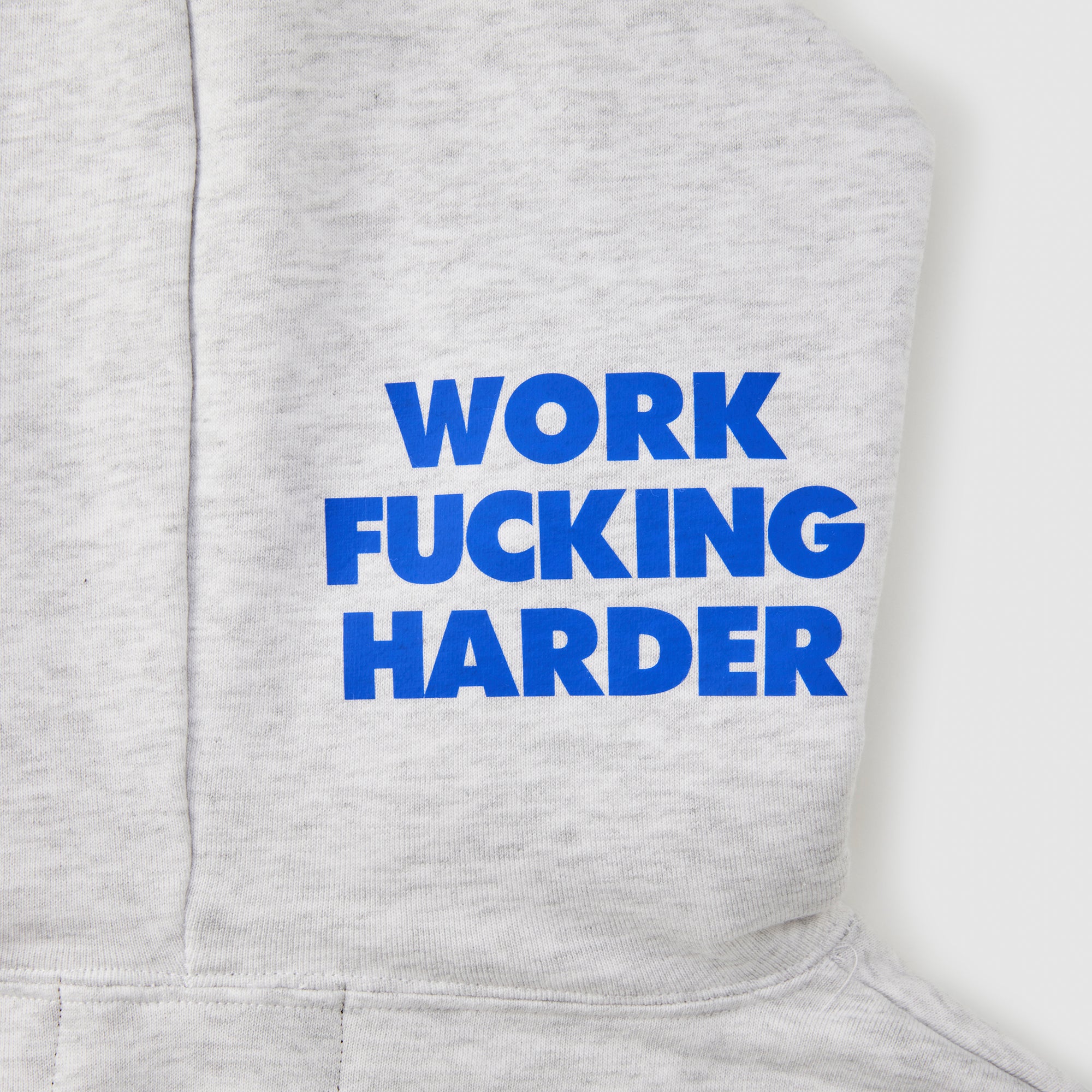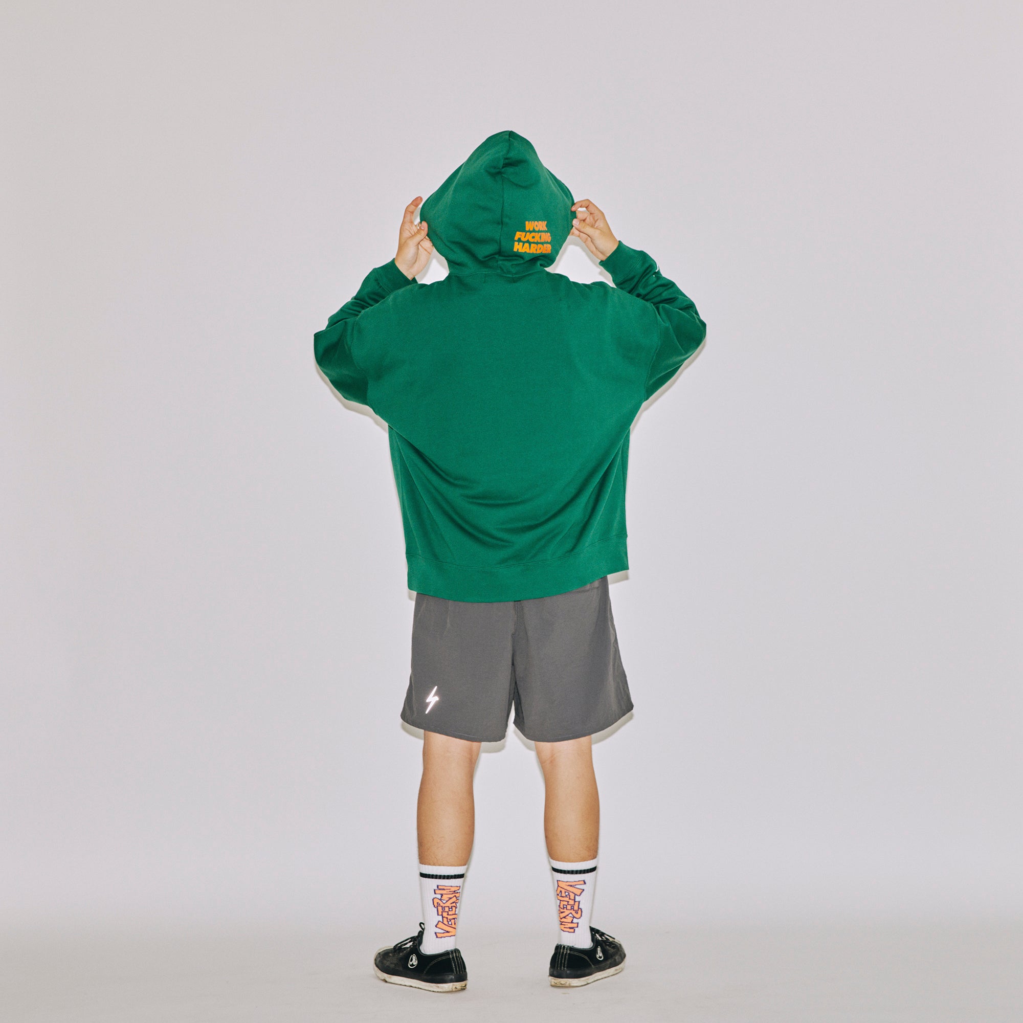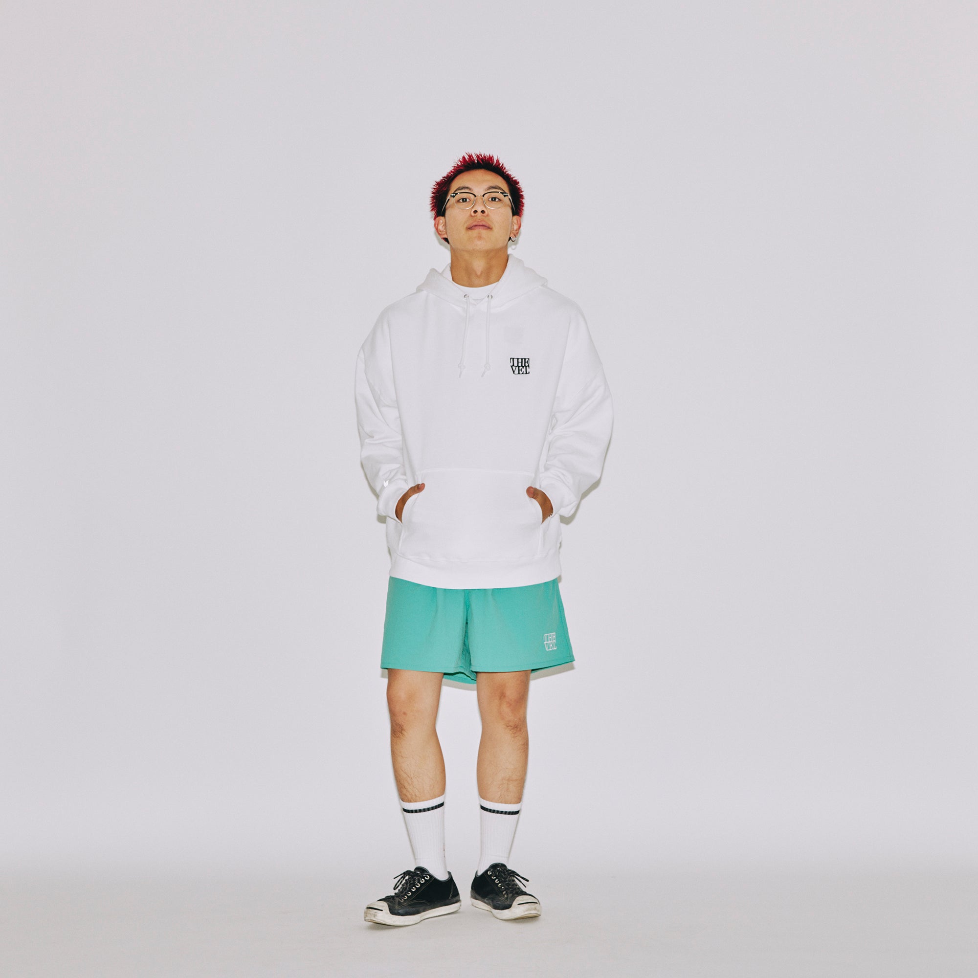 左胸に「THE VET.」の刺繍が入り、右袖に「VTカミナリ」のリフレクタープリント、フードを被った時に見える「WORK FUCKING HARDER(もっと頑張れ」のプリントが入った、ビッグシルエットの10オンスの裏パイルスウェットプルパーカー。裾まわりのシルエットが浮かないように絞り込んだ裾口や、ほどよい溜まり感のある袖。フードひものチップ加工。