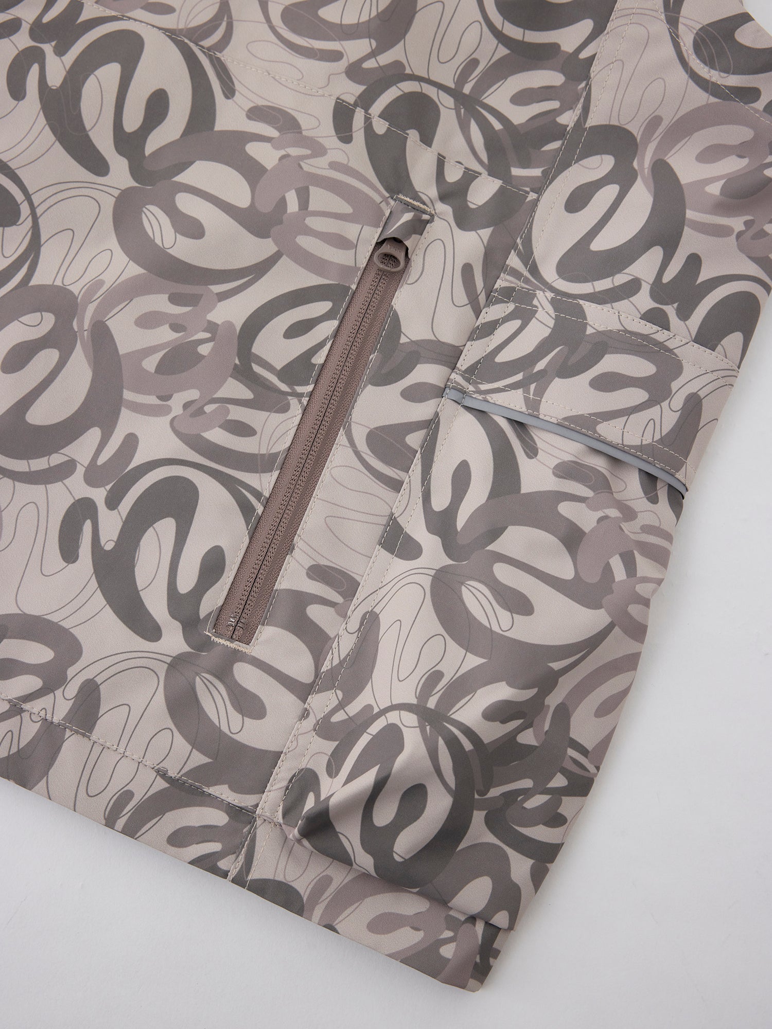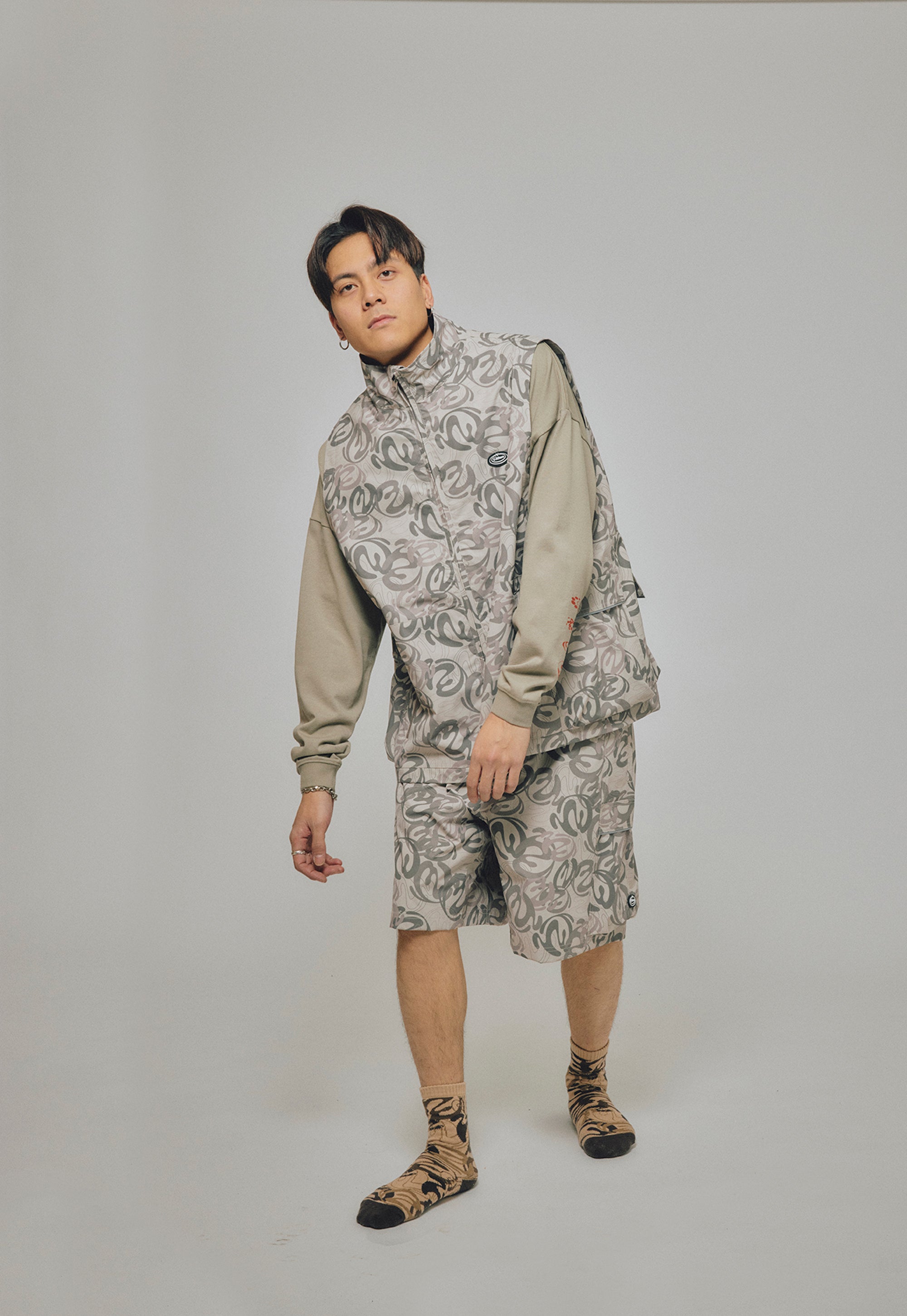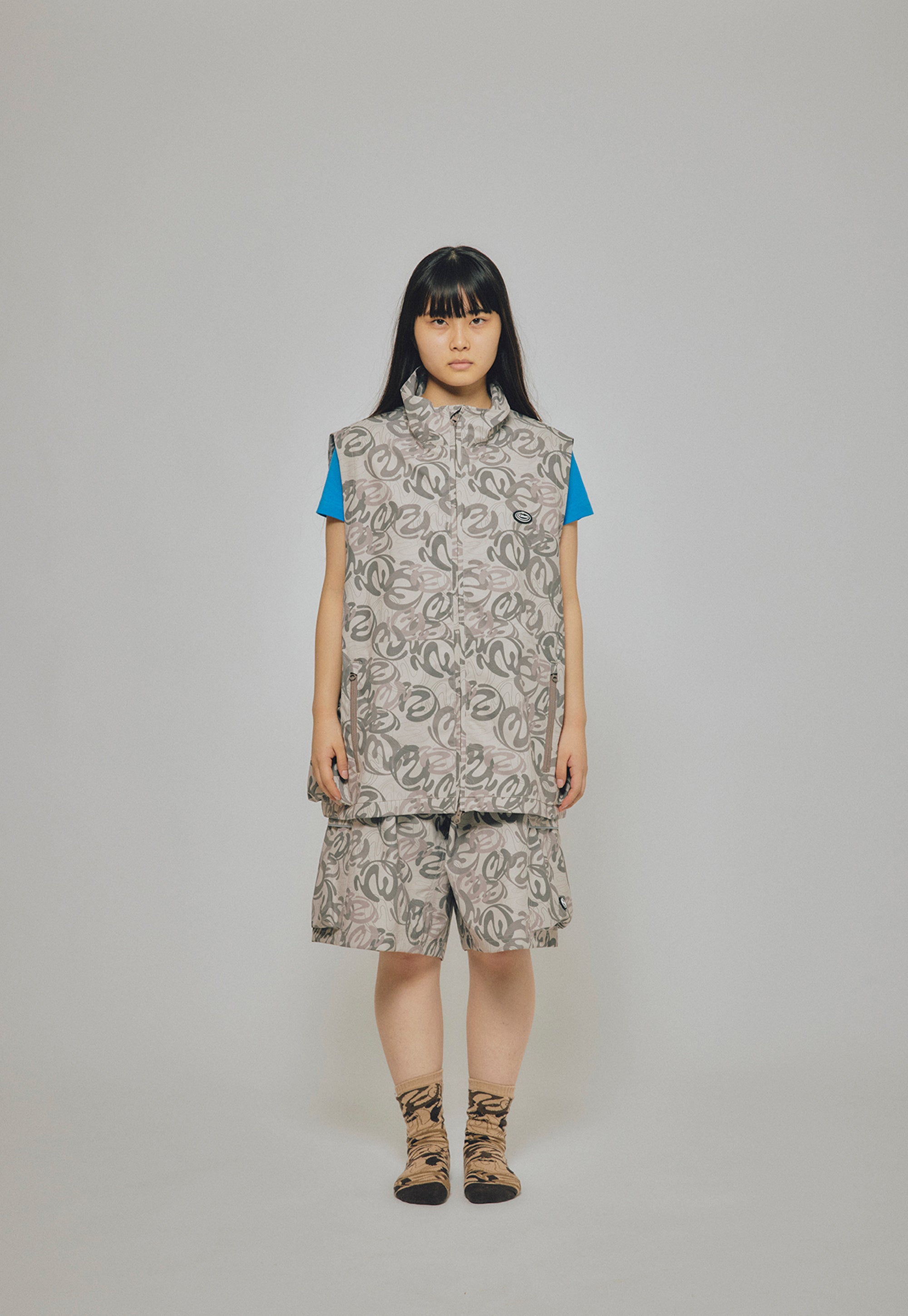 本格的OUTDOORブランドのウェアを作っている工場で作製した、スタンド衿で重ね着や防寒にも重宝する総裏メッシュのVEST JACKET。防風、撥水機能のある生地を使用し、左胸に水にも強いラバー製のワッペン、両脇のポケット口と背中の大きなポケットに反射するリフレクトテープを搭載。背中にベンチレーション仕様。EXTERNALをテーマにしたBLENDグラフィックを総柄にしたBEIGE CAMOとBALCKの2色展開。