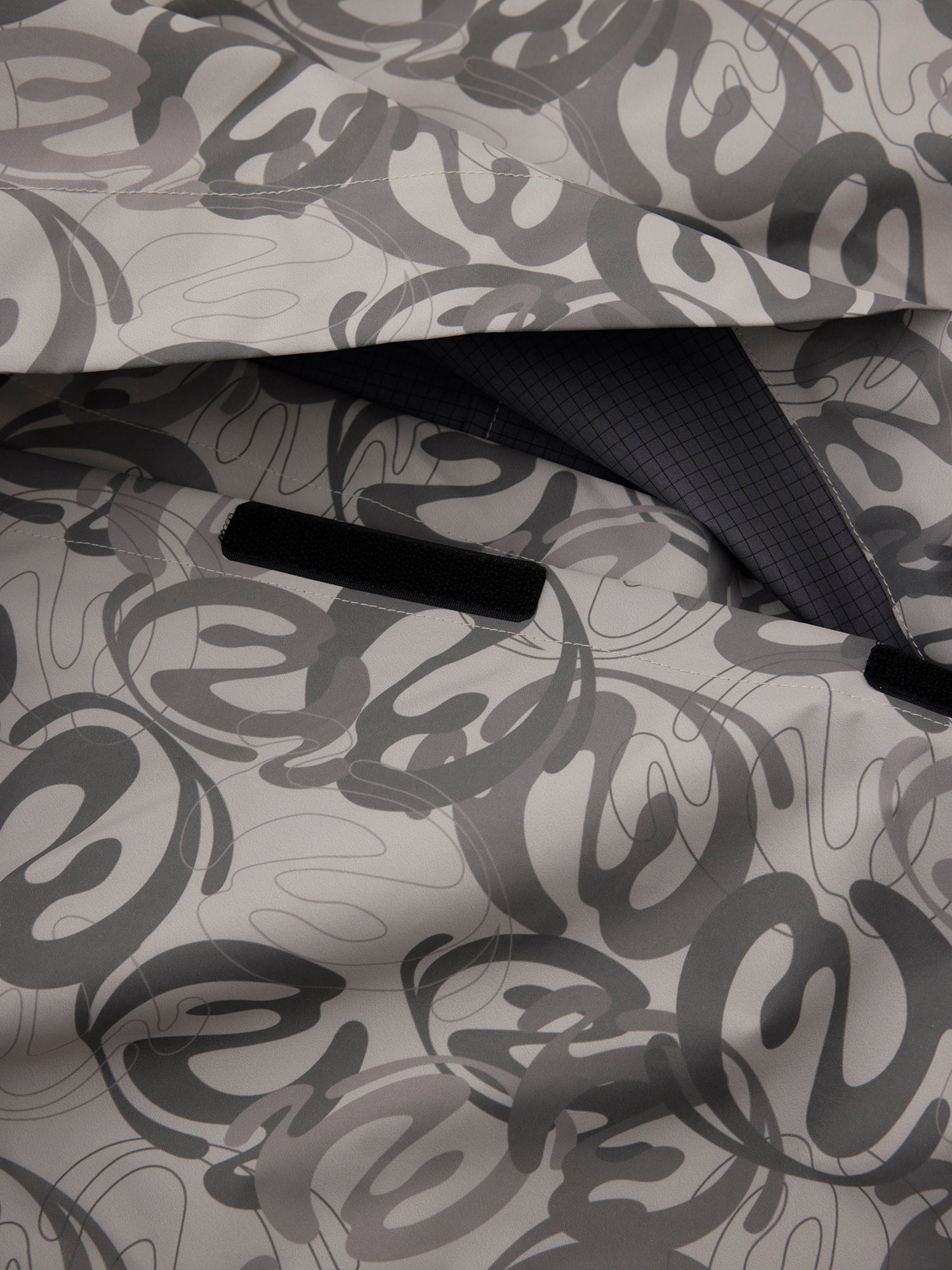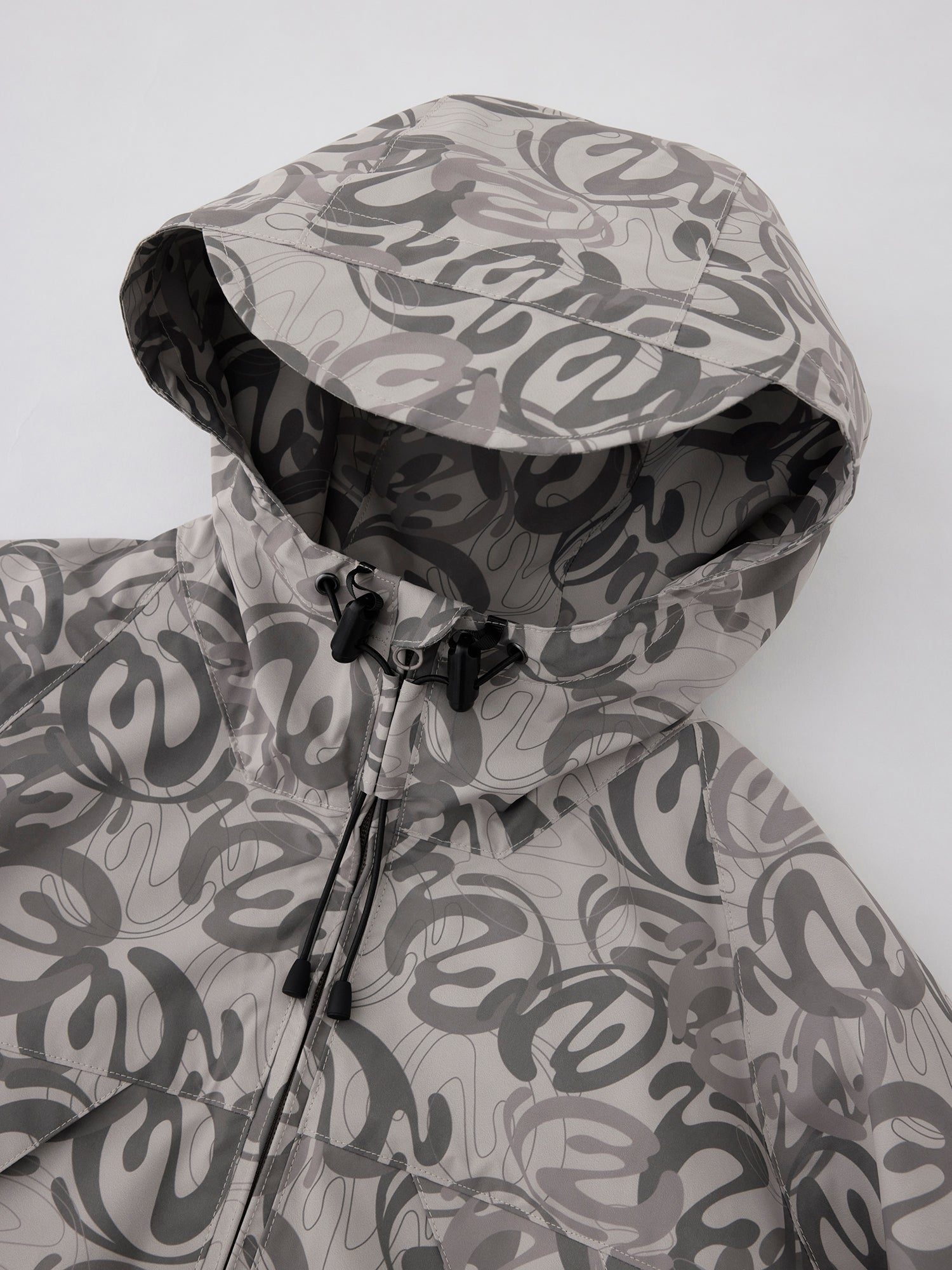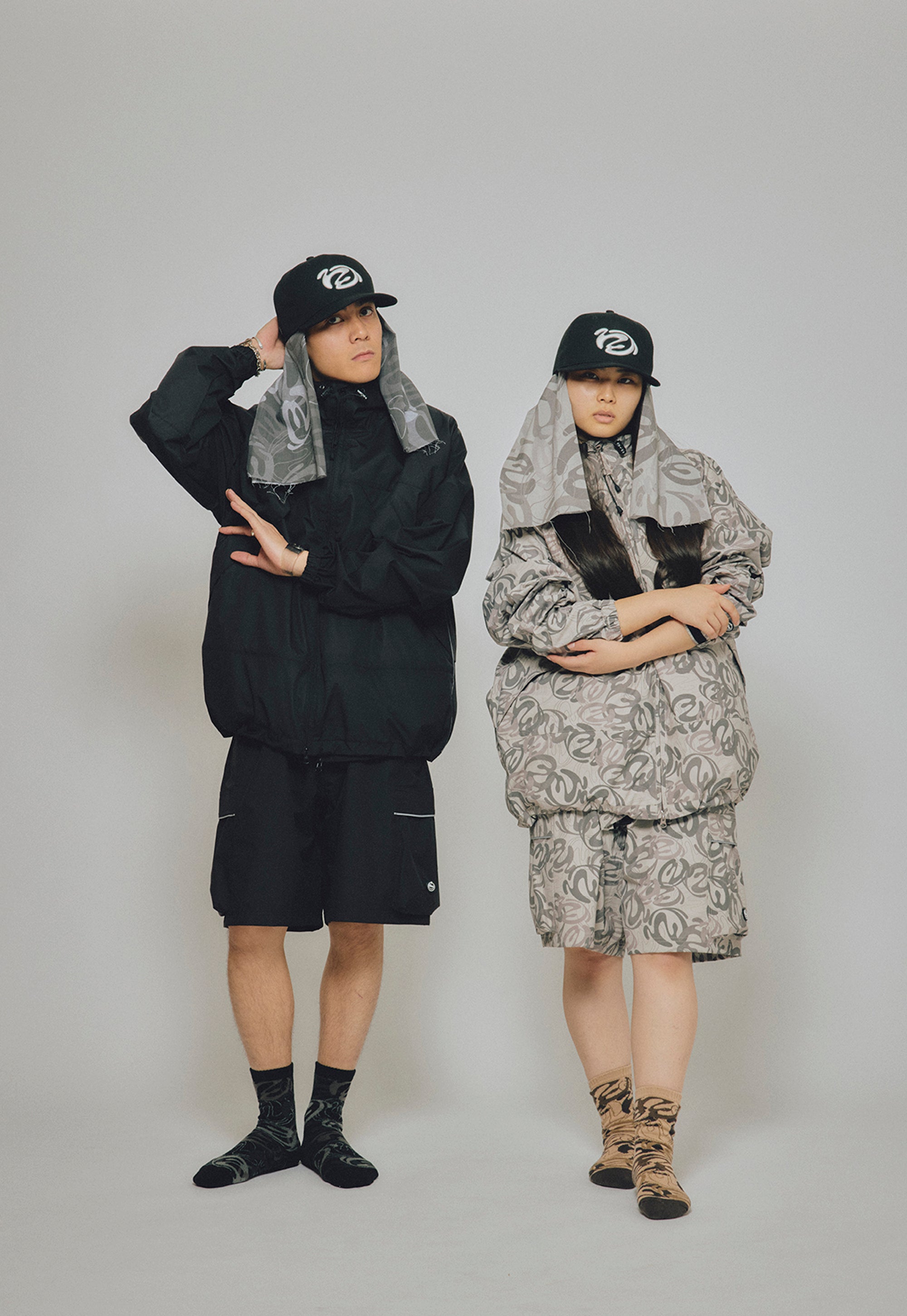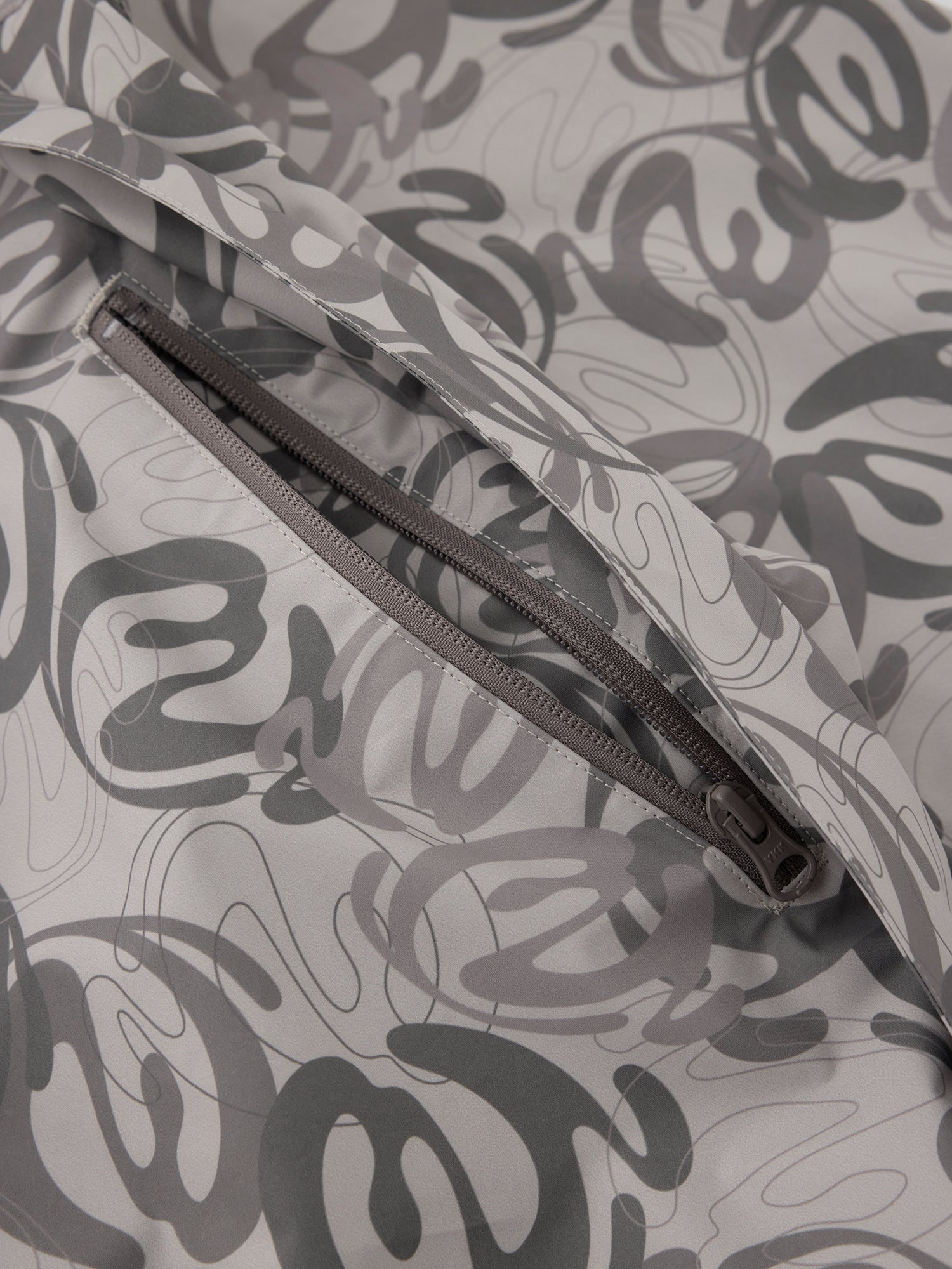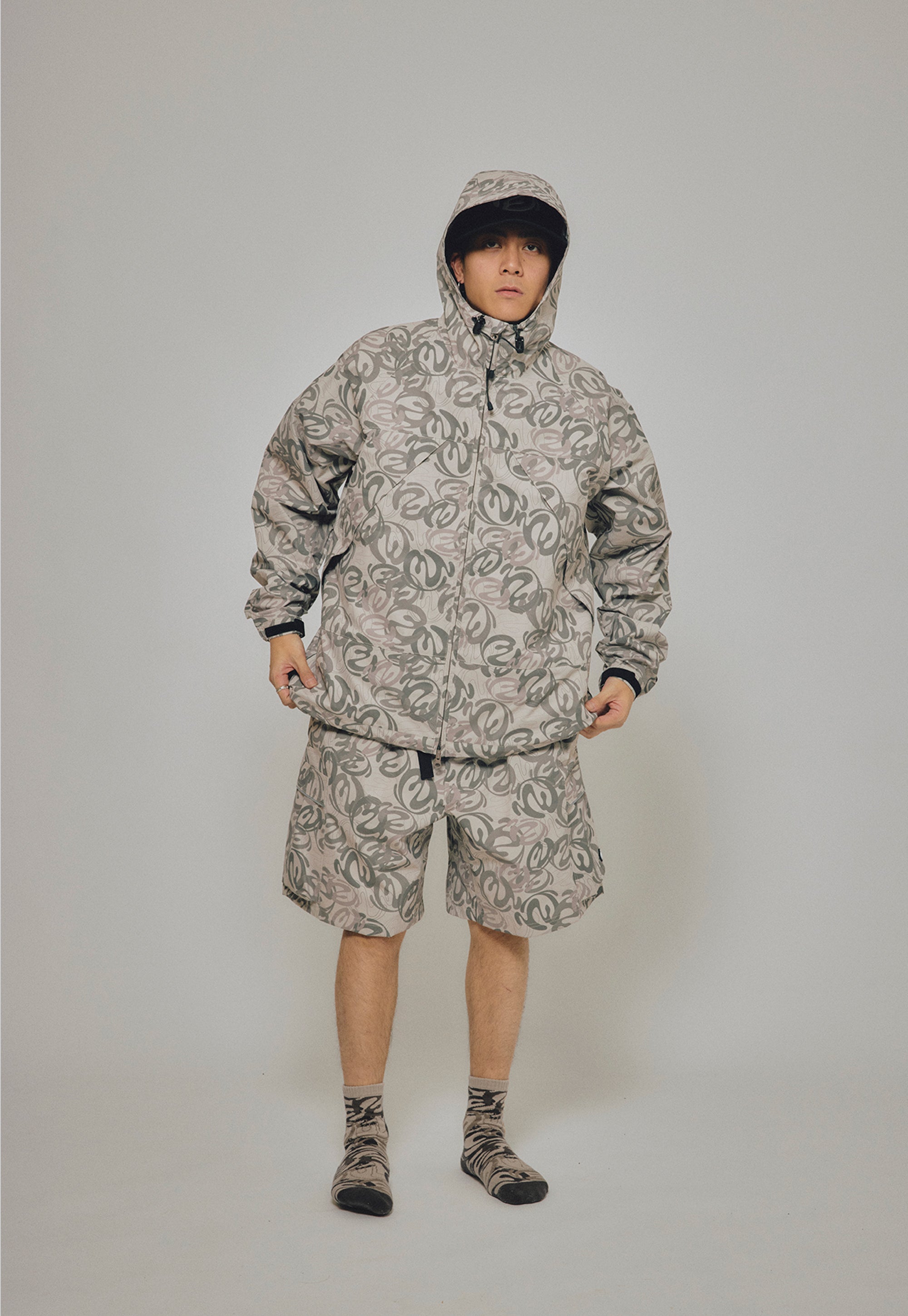 本格的OUTDOORブランドのウェアを作っている工場で作製した、BOX型のシルエットのラグランスリーブHOODIE ZIP JACKET。防風、撥水機能のある生地を使用し、左袖に水にも強いラバー製のワッペン、フードや袖口のサイズ調節、脇に反射するリフレクトテープを搭載。背中の大きなポケットはベンチレーションにもなっている仕様。EXTERNALをテーマにしたBLENDグラフィックを総柄にしたBEIGE CAMOとBLACKの2色展開。